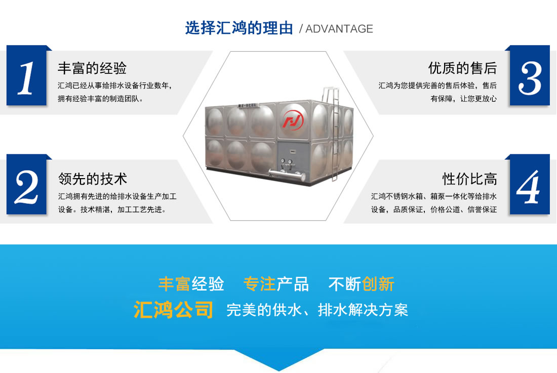 鹽城匯鴻供水設(shè)備有限公司是一家專業(yè)從事供排水設(shè)備系統(tǒng)生產(chǎn)、銷售與工程安裝于一體的專業(yè)企業(yè)。本公司主要生產(chǎn)、銷售、安裝各類不銹鋼水箱、箱泵一體化、不銹鋼保溫水箱、組合式水箱、聚氨酯保溫模塊、圓柱形水箱、消防水箱、玻璃鋼水箱、玻璃鋼化糞池等十多個系列數(shù)百種規(guī)格,產(chǎn)品廣泛應(yīng)用于建筑、環(huán)保、化工、食品、消防等各個領(lǐng)域。具有優(yōu)質(zhì)高效、節(jié)能環(huán)保、安全可靠、實(shí)用方便等優(yōu)點(diǎn),是二十一世紀(jì)商用和家用生活的首選產(chǎn)品。本公司生產(chǎn)設(shè)備先進(jìn),技術(shù)精湛,各種產(chǎn)品的加工工藝,技術(shù)性能和衛(wèi)生指標(biāo)均符合國家標(biāo)準(zhǔn),并可根據(jù)用戶提供的技術(shù)參數(shù)和要求設(shè)計(jì)制造現(xiàn)場加工……【更多詳情】 | |